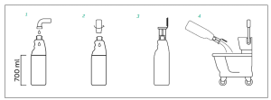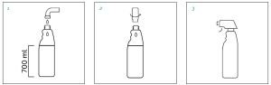 3. W przypadku produktu butelkowanego przykleić etykietę identyfikacyjną odpowiadającą produktowi i przykręcić atomizer, aby był gotowy do użycia. W przypadku produktu w wiadrze przykleić etykietę identyfikacyjną na butelkę, nałożyć nasadkę dozującą i wlać żądaną dawkę do wiadra.