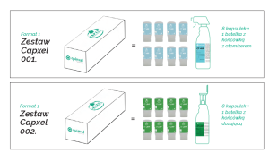 · Format 1 – ZESTAW CAPXEL: Opakowania CAPXEL zawierające 8 wysoce skoncentrowanych kapsułek i butelkę z atomizerem lub dozownikiem, w zależności od sposobu użycia produktu.